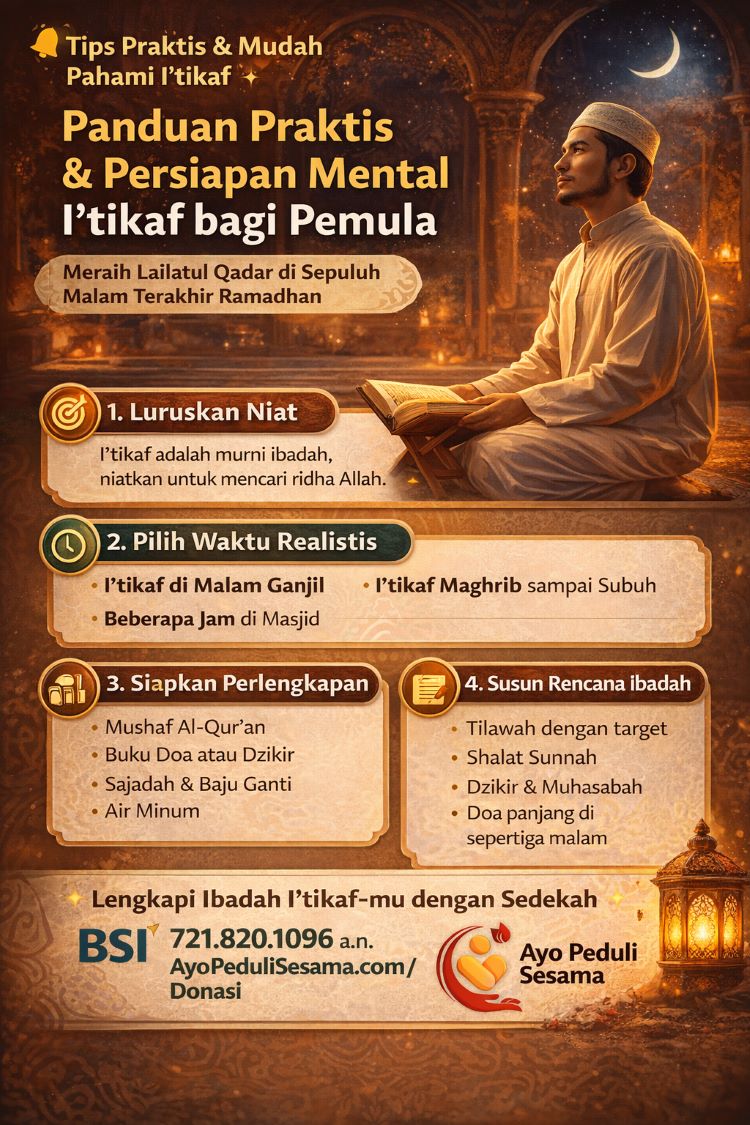 I’tikaf bukan ajang menunjukkan kesalehan. Niatkan semata-mata mencari ridha Allah dan memperbaiki diri. Semakin sederhana niatnya, semakin ringan langkahnya.